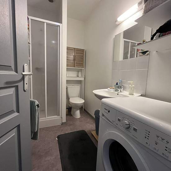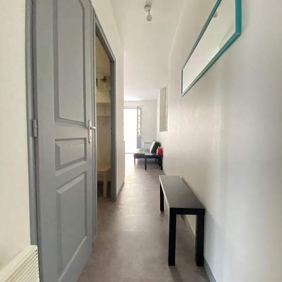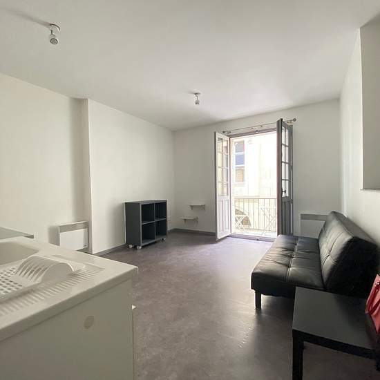 Cet appartement rénové situé en face du théâtre comprend une entrée, une chambre, une cuisine ouverte sur salon séjour donnant sur un balcon, une salle de douche avec WC. Le mobilier présent sur les photos est mis à disposition.
