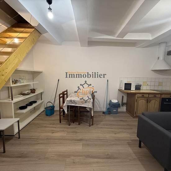 A louer Saint Affrique, centre-ville, appartement T1 bis meublé duplex, rez-de-chaussée, 40 m2 habitables. salon-séjour avec cuisine équipé (plaque induction, hotte, four, réfrigérateur), à l'étage chambre et salle d'eau avec w-c. Cave 20 m2. hubert-peyrottes-immobilier.fr