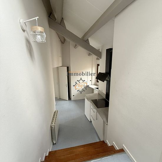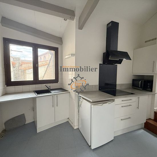 A louer Saint Affrique, centre-ville, Place de la Liberté, appartement de type 2 en 3eme étage. 34 m2 habitables, séjour avec cuisine équipée ouverte (plaque électrique, hotte, frigidaire top, micro-ondes), chambre avec placard, salle d'eau avec w-c. hubert-peyrottes-immobilier.fr