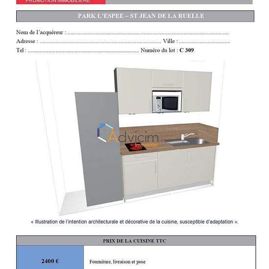 SAINT-JEAN DE LA RUELLE, dans la résidence neuve PARK L'ESPEE, nous vous proposons un logement T2 N°C309 de 44.21m² sis au 3ème étage avec ascenseur . Il se compose, d'une pièce de vie de 24.79m² avec cuisine ouverte sur séjour et donnant sur un balcon de 7.65m², une chambre de 11.42m², une salle d'eau avec douche, meuble vasque et WC. En extérieur, un parking N° PKA17. Eau froide individuelle. Chauffage et eau chaude en individuel gaz, entretien des parties communes et espaces verts communs, compris dans les provisions sur charges mensuelle...