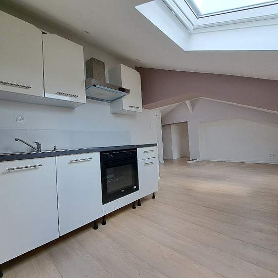 49 rue Albert Denis, idéal célibataire ou jeune couple, appartement de type F2 bis d'environ 30m² sous combles. Cuisine aménagée et équipée (hotte, plaque de cuisson, four, réfrigérateur) ouverte sur séjour, 1 chambre + 1 bureau, salle d'eau avec wc. Chauffage électrique (env 80?/mois). Toutes nos annonces sur