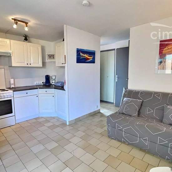 LOCATION SAISONNIERE: Profitez de vos vacances dans un appartement de 21m2 à 150m de la plage. Cet appartement idéal pour un couple avec 2 enfants se trouve au deuxième étage d’une résidence sécurisée avec piscine, le logement dispose d’une place de parking. Il est composé comme suit : Une chambre cabine avec lit superposé (2x90), d’une salle d’eau, et toilettes indépendant et d’un séjour avec canapé lit double (140) ouvert sur une cuisine aménagé disposant d’un four, micro-ondes, et de plaque induction le tout ouvert sur une véranda lumineu...
