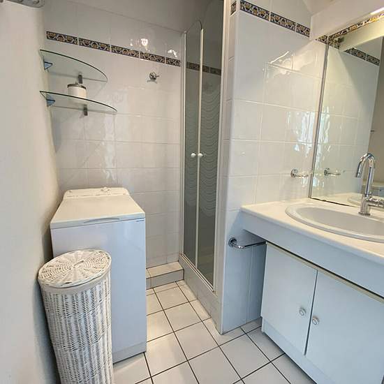 Dans résidence de bon standing avec piscine et ascenseur, à 150 m de la plage et des commerces de ROYAN Pontaillac, appartement 2 pièces + cabine, total superficie 32m2, comprenant : entrée, séjour avec canapés BZ + TV et coin cuisine équipé ouvrant sur belle terrasse avec aperçu MER, chambre avec lit 140 et placard donnant sur terrasse, cabine avec 2 lits superposés et placard, salle d'eau et WC séparé avec placard. Piscine collective ouverte Juillet/Aout.