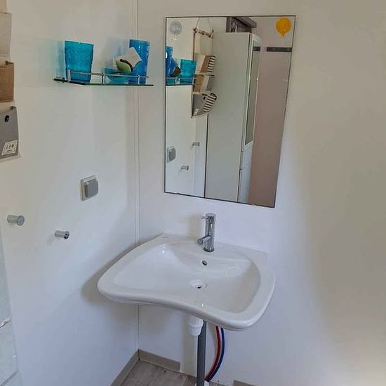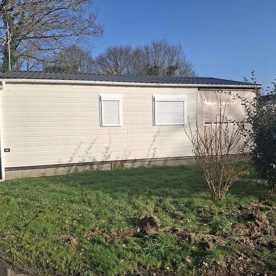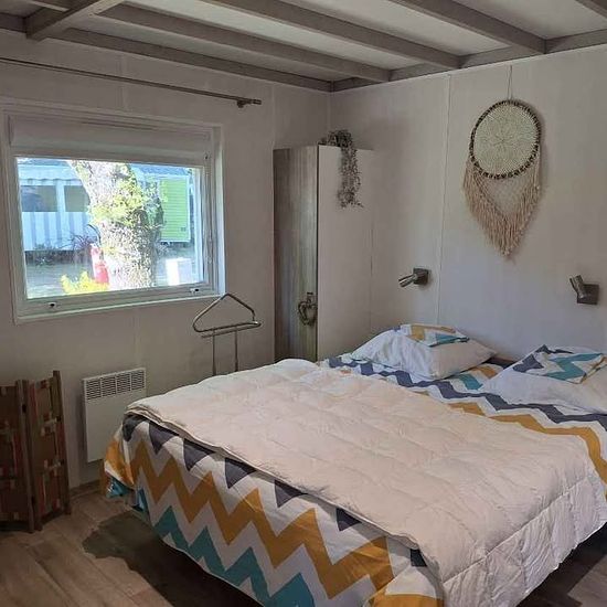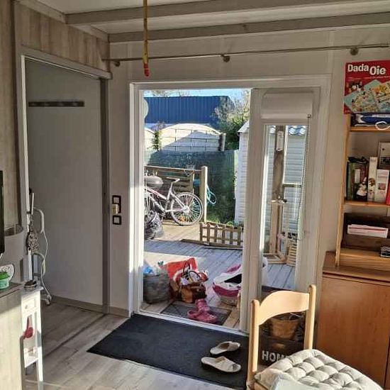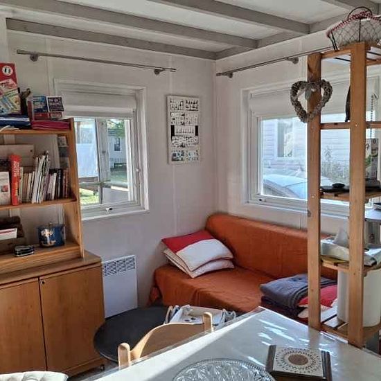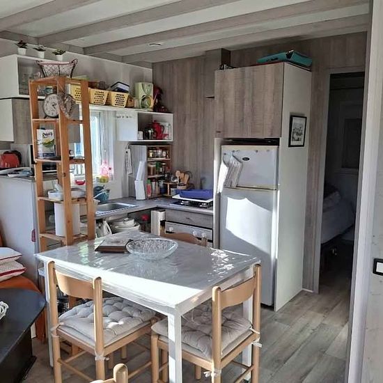 Possibilité de louer 6 mois. Si tel est le cas, dépôt de garantie de 700€, avec forfait pour charges d’eau et d'électricité de 100€/mois. 0 Chalet de 35m2+terrasse entièrement couverte et fermée de 15m2. Entièrement meublé. 1 grande chambre avec lit 160+ 2 penderies 1 chambre lit de 140+ 1 penderie ,TV. 1 cuisine ouverte (frigo, four et plaques de cuisson gaz,micro-ondes, cafetières, vaisselle etc) sur pièce de vie avec table, 4 chaises et banquette. TV . VMC Volets roulants sur toutes les ouvertures. Salle d’eau (douche à l’italienne), wc. ...