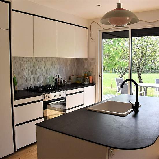 Vezin Immobilier - A louer, proche du bourg de La Chapelle de Brain avec ses commerces et son école, agréable maison de 76 m2 sur un terrain de 1 100 m2. Elle comprend une entrée, un grand salon séjour exposé sud de 49 m2 sur parquet bois avec une cuisine aménagée et équipée (hotte, plaques gaz, réfrigérateur, four et lave vaisselle) et un poêle à pellets, cette grande pièce donne sur une terrasse au sud (32 m2), une chambre avec dressing, une salle d'eau avec douche et sèche serviette, une buanderie avec branchement machine à laver et ballo...