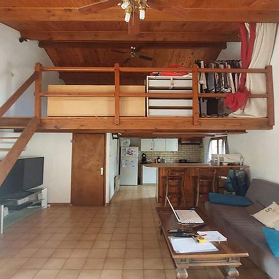 Agence Bellissimmo Narbonne vous présente : Narbonne Ouest : Maison de 50m² libre sur 2 faces, composée d'un séjour donnant sur cuisine aménagée, salle d'eau, WC, chambre sur mezzanine, garage sur 183m² de terrain clos et arboré .