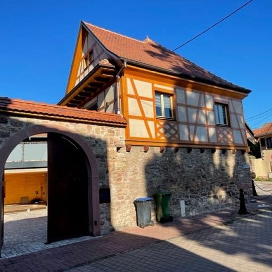 Belle maison Alsacienne entièrement rénovée comprenant une entrée, une cuisine ouverte entièrement équipée, une terrasse, un salon-séjour, une chambre avec salle d'eau, un wc séparé. A l'étage une mezzanine, une chambre avec salle d'eau. Une cour avec espace vert. Chauffage au gaz et climatisation.