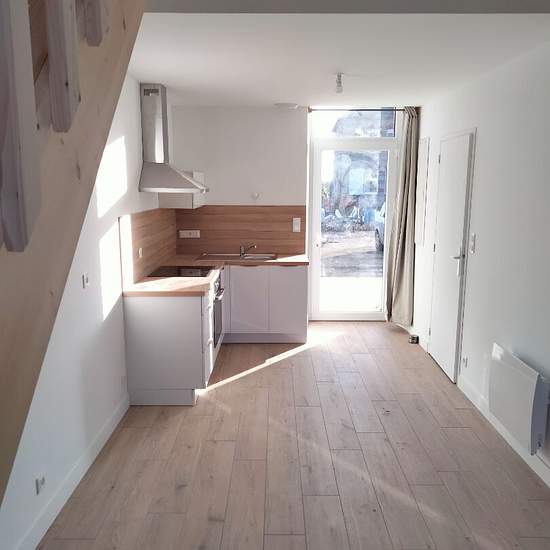 A louer appartement composé au rdc d'une pièce de vie avec une cuisine aménagée et équipée (hotte-plaque-four) coin séjour, une salle d'eau/wc. A l'étage : une chambre avec placard et un bureau. Terrasse exposée sud et cellier. Libre de suite Loyer 535EuroC.C. Honoraire agence : 445Euro dont 124Euro pour état des lieux. Dépôt de garanti 535Euro. Classe Energie D "Les informations sur les risques auxquels ce bien est exposé sont disponibles sur le site
