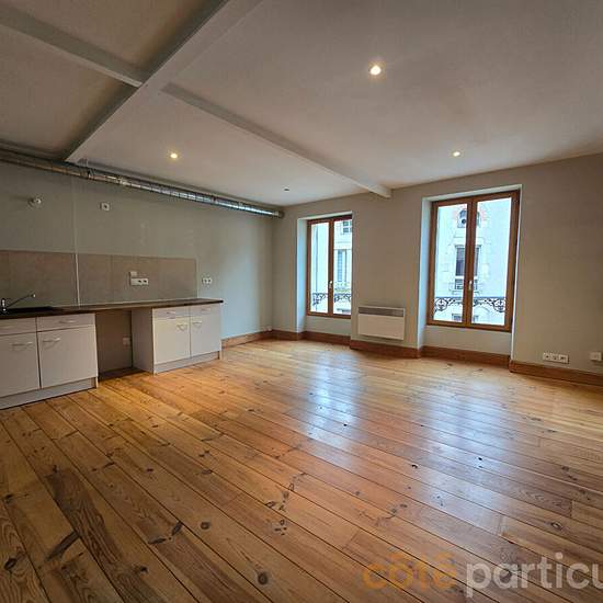 Centre ville d'AGEN, quartier Cornières, au deuxième étage, appartement T2 bis de 65 m². Entrée, séjour avec cuisine ouverte, 1 chambre et 1 bureau, 2 salles d'eau, 2 Wc. Loyer 570 euros charges comprises (communs et taxe d'ordures ménagères. Honoraires d'agence locataire 520 euros + Etat des lieux par huissier de justice 115 euros TTC. Disponible immédiatement.