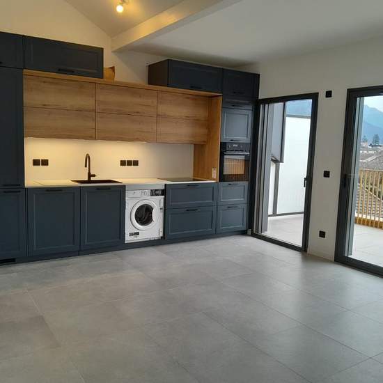 ANNECY LE VIEUX, dans résidence neuve, au calme, belles prestations pour cet appartement de type T3 en dernier étage, comprenant une entrée avec deux placards, un lumineux salon séjour avec cuisine équipée ouverte (plaques de cuisson, four, hotte, réfrigérateur/congélateur, lave vaisselle et lave linge) donnant sur une terrasse exposée sud avec vue lac, deux chambres avec chacune un placard et donnant poour l'une sur un balcon, une salle de bains et wc séparé. Chauffage et eau chaude individuel au sol par PAC avec rafraichissement l'été. Un ...