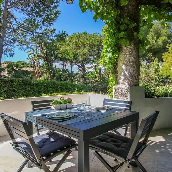 Location Saisonnière - Emplacement exceptionnel à pied des plages, bel appartement dans une petite résidence avec piscine. Composé d'une entrée, séjour /salle à manger, cuisine, 2 chambres climatisées, une salle de douche, une salle de bains avec toilette et un toilette invités. Agréables terrasses ensoleillées. L'appartement est situé à quelques mètres du port de l'Olivette et plage des Ondes. Chemin privé sécurisé par deux portails. Place de parking. Animaux non admis.