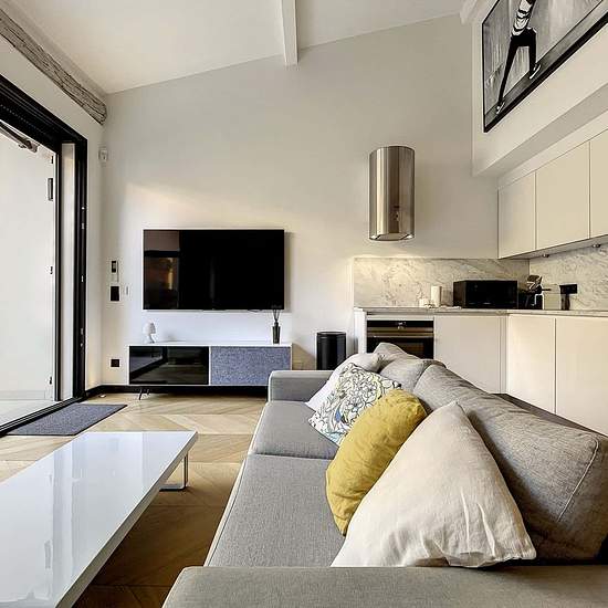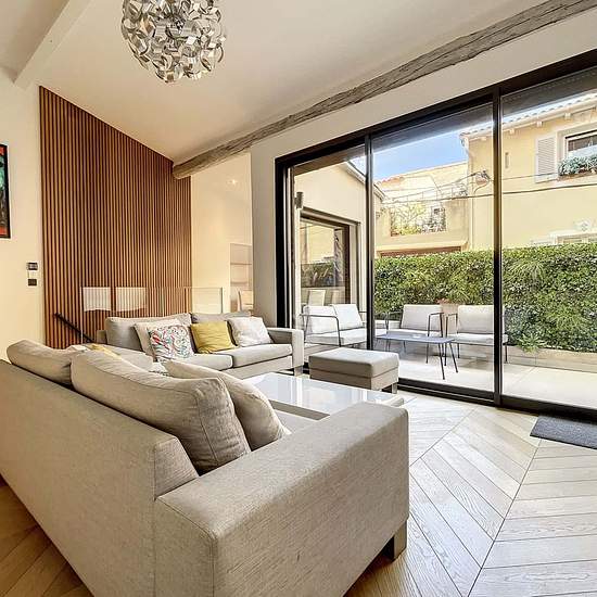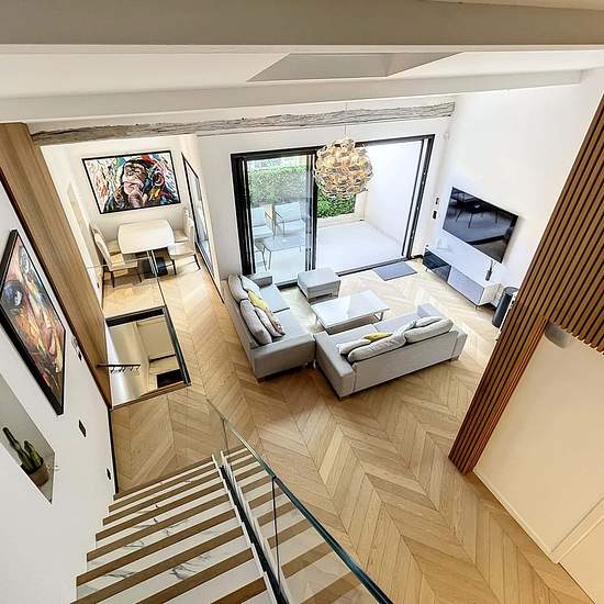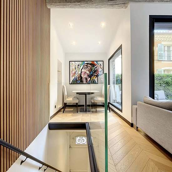 The space Luxueuse maison de ville de 97 m2 avec grande terrasse composée : - Au rez-de-chaussée, de rangements et local à velo. - Au 1er étage (étage principal) d'un large séjour avec cuisine équipée, un coin salle à manger avec rangements sous escaliers, 2 chambres, une salle de douche avec WC. - Au dernier étage une chambre de maître avec salle de bains, WC et dressing. Toutes les pièces sont climatisées. Rénovée avec goût, typique du vieil Antibes (pierres et poutres apparentes, belle hauteur sous plafond). Elle est située en plein coeur...