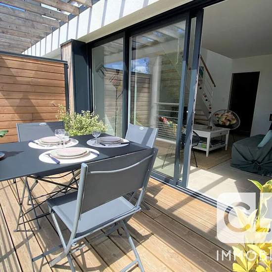 Appartement duplex lumineux et récent de type 3 comprenant une entrée avec WC et placards, un salon/séjour ouvert sur une cuisine aménagée et équipée (réfrigérateur, plaque de cuisson, hotte, four, micro-ondes, lave-vaisselle, lave-linge, sèche-linge), 1 chambre avec salle d'eau attenante. A l'étage se trouve une grande chambre. Viennent compléter l'ensemble : un grand balcon, une cave et une place de parking. Disponible immédiatement !