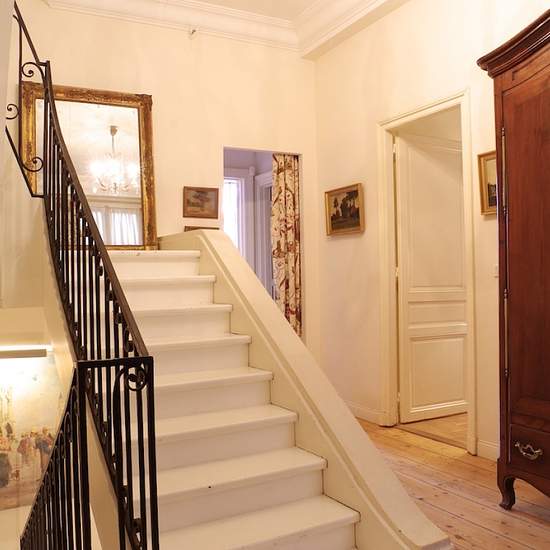 Location meublée dans une maison bourgeoise mitoyenne de haut standing, d'une surface de 320 m² avec 6 chambres et un jardin d'environ 300 m². Une place de parking privée est comprise dans le loyer. Au rez-de-chaussée : une entrée avec cage d'escalier, un salon tout équipé avec deux canapés, des fauteuils, une table basse, une télévision et internet/wifi, une salle à manger avec une table pour 8 personnes, une cuisine séparée donnant sur jardin et entièrement équipée avec four, micro-ondes, lave-vaisselle, réfrigérateur/congélateur, plaque...