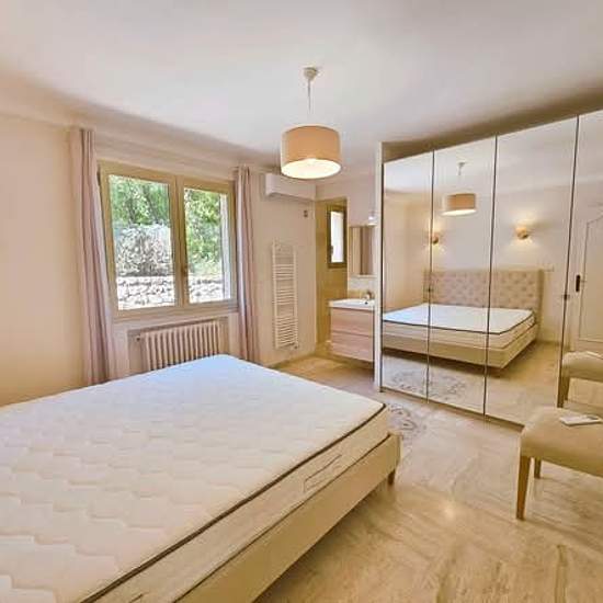 Mougins dans le quartier résidentiel de la Grande Bastide, Magnifique appartement 4/5p de 124 m2 au 1er étage d'une villa, entièrement rénové et meublé à neuf, il se compose d'une vaste entrée au rdc avec de grand placards pouvant servir de bureau, A l'étage un double séjour de 35m2 avec cheminée insert donnant sur une agréable terrasse avec jardin privatif, une cuisine américaine entièrement équipée, un wc invité , 3 chambres avec placards très spacieuses ( 13, 14 et 15 m2) dont une avec douche et lavabo , une salle d'eau avec armoire linge...
