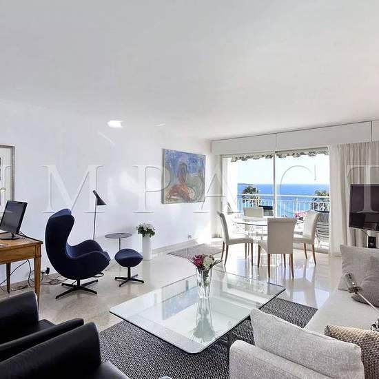 Magnifique appartement d'environ 94m² situé au 6ème étage d'un immeuble de standing à Cannes, Croisette avec gardien. Exposé Sud avec une magnifique vue mer panoramique et collines de Cannes. Terrasse et véranda. Entrée Séjour avec canapé et chaises pour 4-6 personnes et télévision écran plat, ouvrant sur la terrasse sud aménagée en espace lounge. Coin table à manger pour 4 personnes avec une vue directe sur la mer. Coin bureau. Cuisine entièrement équipée s’ouvrant sur véranda fermée: cuisinière, four, micro-ondes, lave-vaisselle, réfrigéra...