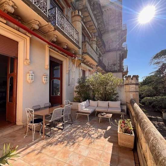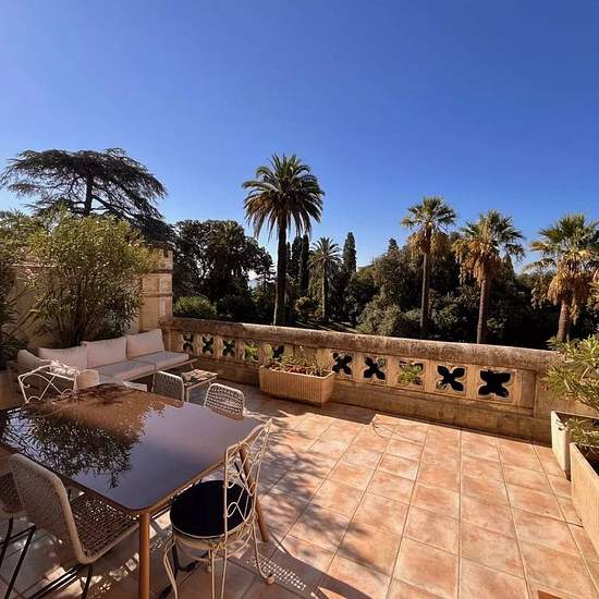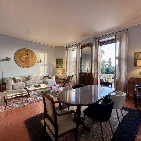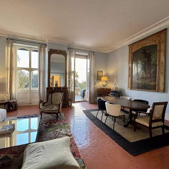 EXCEPTIONNEL ! Au sein d’un prestigieux palais de 1850 inscrit aux Monuments Historiques, découvrez ce somptueux appartement bourgeois de 130 m² avec 4 mètres de hauteur sous plafond. Il offre une vaste terrasse de 30 M2 avec vue panoramique sur le parc et la mer, une réception de 45 M2, deux élégantes chambres et deux salles de bains. Idéalement situé, à seulement 4 minutes à pied de la Croisette du bord de mer et des plages. Parking fermé et ascenseur, très jolies parties communes. Le chauffage est inclus dans les charges. Visite virtuelle...