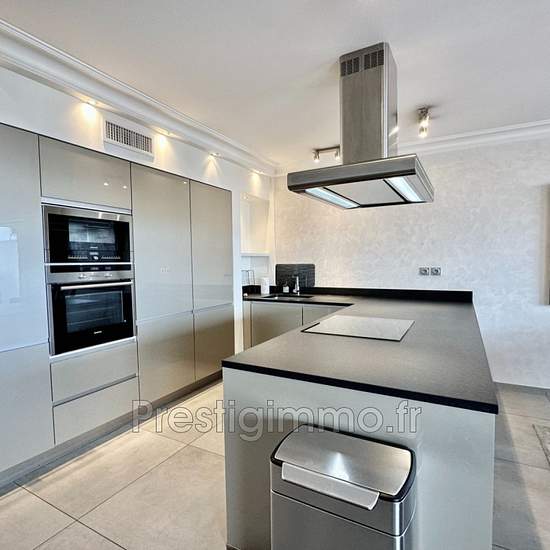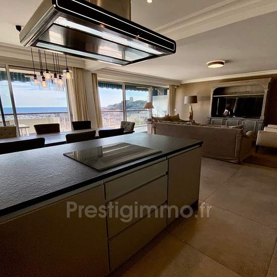 CANNES bas petit Juas très bel appartement de standing 7em étage 3P 100m² vue mer panoramique sur la baie de Cannes et les iles de Lérins. L'appartement comprend 1 entrée avec buanderie, 1 vaste séjour lumineux de 53m² avec cuisine américaine équipée, terrasse de 25m², une chambre en suite avec salle de bain + douche une terrasse, 2éme chambre avec bureau et salle de douche, un wc indépendant. 1 place de parking , 1 cave. Centre ville, plages, commerces, bus et gare Proche à pied. Loyer 3900€ cc Caution 7100€ Honoraire 3900€ (bail non réside...