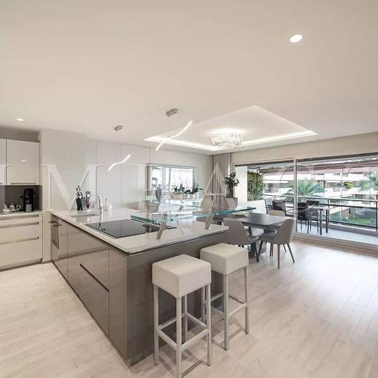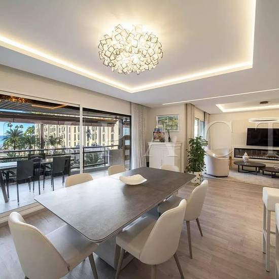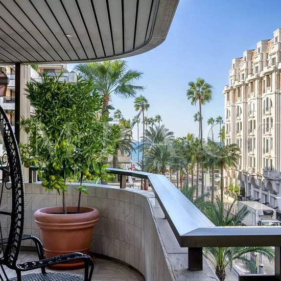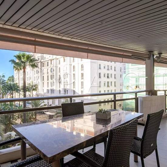 Résidence Gray d'Albion En deuxième ligne Croisette, mitoyen de l'Hôtel Majestic, à proximité immédiate, du Palais des Congrès, des commerces et restaurants, dans une résidence de grand standing sécurisée 24/7. Très bel appartement 3 pièces, au 3ème étage avec ascenseur et parking en sous sol, entièrement rénové exposé Sud, 110 m² sur belle terrasse d'angle 32 m² aménagées en salon & salle à manger d'été, aperçu mer. Description : Hall d’entrée, toilettes & dressing invitées. Beau et vaste séjour (65 m2) ouvrant par 3 baies vitrées sur la te...