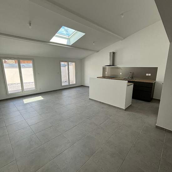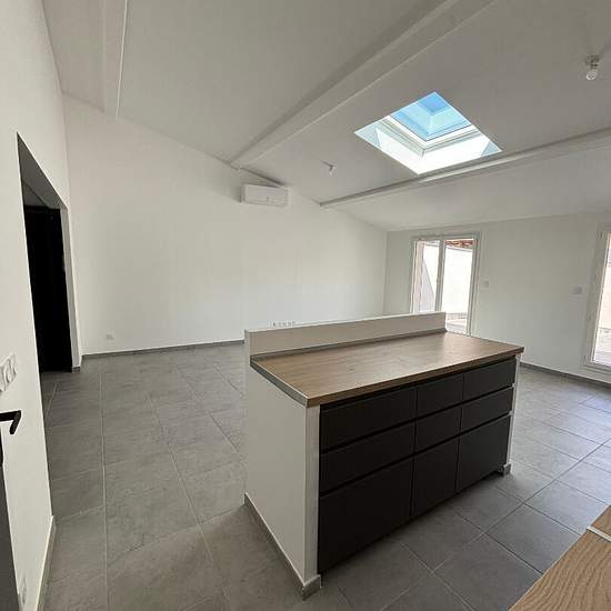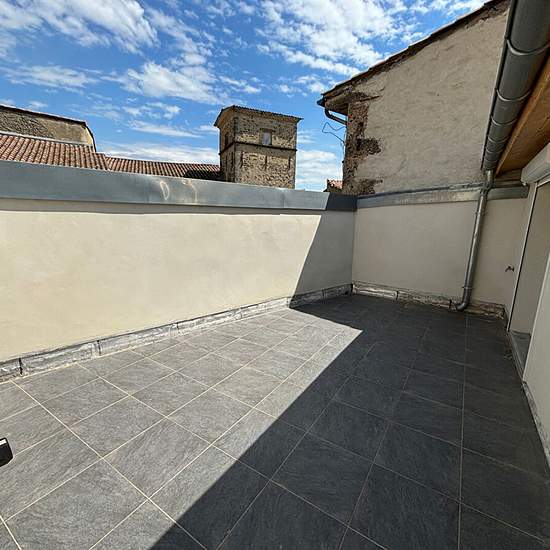 Rue Correcterie, dans le centre ancien de Chabeuil, appartement en duplex entièrement refait à neuf composé d'une entrée avec rangements, un vaste séjour, une cuisine équipée, de deux chambres à l'étage, une salle de bains et toilette séparé. Climatisation réversible. Bel terrasse de 20m2. Disponible fin Avril 2026