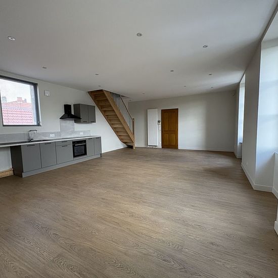 CHARLIEU Boulevard Eugénie Guinault - Charmant duplex entièrement rénové de type 3 d'une surface habitable de 72,76 m2 offrant une vaste pièce de vie lumineuse de 42 m2 avec cuisine équipée (hotte, plaque de cuisson, four). A l'étage, un déganement ouvrant sur 2 chambres, une salle d'eau et un WC. Buanderie sur le pallier et grenier. Chauffage individuel gaz. Disponible de suite. Loyer : 580,00 EUR FA: 417,60 EUR TTC