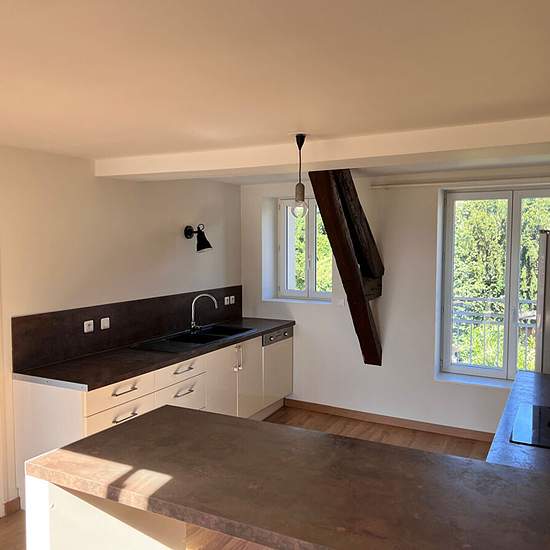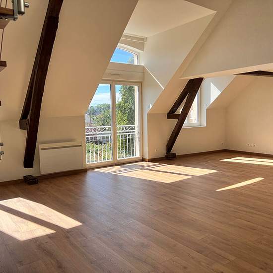 Prestations de qualité - Appartement proche du centre-ville à pied en duplex comprend entrée, cellier, vestiaire, pièce de vie, cuisine équipée avec four, plaque, hotte, réfrigérateur et lave-vaisselle, buanderie, un wc avec placard. A l'étage : un palier desservant 2 chambres dont une avec placard, salle de bain et wc. Disponible de suite. Loyer : 892 euros - TOM : 25 euros - Honoraires de location : 667,50 euros