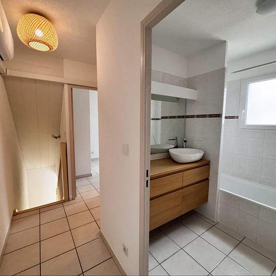 Appartement de 52 m² à louer sur Clermont-l'Hérault Appartement est situé dans un immeuble sécurisé à côté de la gare routière et d'Hyper U à Clermont l'Hérault. L'appartement en duplex fait 52,45 m² et dispose d'une terrasse d'environ 5 m² et d'une place de parking. Le Duplex dispose au premier niveau d'un séjour climatisé donnant sur terrasse et d'une cuisine équipée (four, frigo-comb (neuf), lave-linge (neuf), lave-vaisselle (neuf), plaques inductions (neuve) et évier (neuf). À l'étage (climatisé) se trouve deux chambres dont une avec gra...