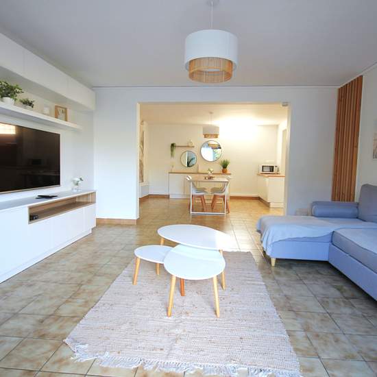 À louer à l'année - Appartement Meublé - Bail 12 mois renouvelable Très bel appartement rénové 3 pièces SH 81m2 environ avec Terrasse, parking et garage 24.40 m2 environ Séjour-salon, coin repas ouvert sur cuisine équipée, dégagement coin nuit 2 chambres, salle d'eau, wc séparés. Belle terrasse privative. Box de garage privatif + 1 emplacement de parking extérieur. Loyer mensuel : 1050 EUR + 30 EUR prov. s/charges Visites sur rendez-vous au