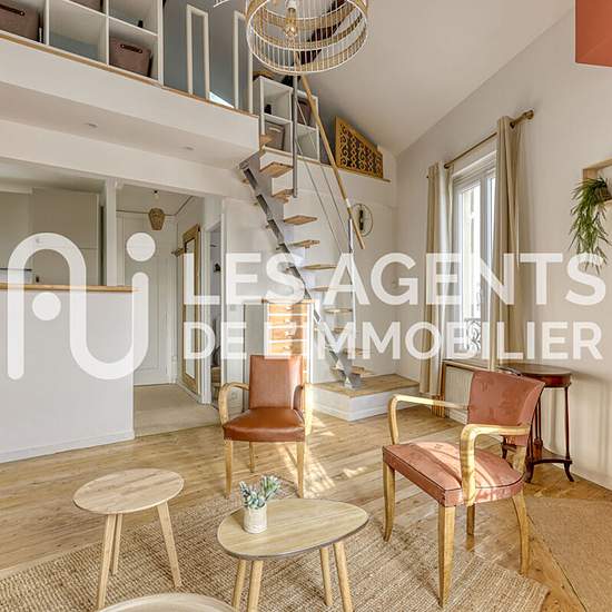 Dans un quartier calme et résidentiel, proche du centre-ville, des commerces et du cinéma, duplex meublé 2/3 pièces au 3ème étage d'un petit immeuble ancien. Entièrement rénové récemment, cet appartement très lumineux, sans vis-à-vis, offre une vue dégagée sur La Défense. Sa surface de 60 m² au sol (pour environ 50 m² de superficie habitable) comprend : séjour parqueté avec cuisine ouverte équipée par lequel on accède à une grande mezzanine de 20 m² (bureau / télétravail / couchage d'appoint), chambre avec rangements,, salle d'eau, WC séparé...