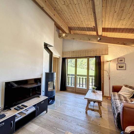 Idéalement situé en plein cœur du village de Combloux, appartement au 2° étage, d'une superficie de 88 m² (loi carrez 55m²) comprenant : entrée, placard, un beau et lumineux salon donnant sur un balcon-terrasse Sud-Ouest, une salle à manger, une cuisine tout équipée avec Lave-Linge, accès sur un balcon-terrasse Nord-Ouest, un WC indépendant, une chambre double avec un lit en 160x200 avec accès également au balcon, une salle de douche/bain. Au niveau supérieur