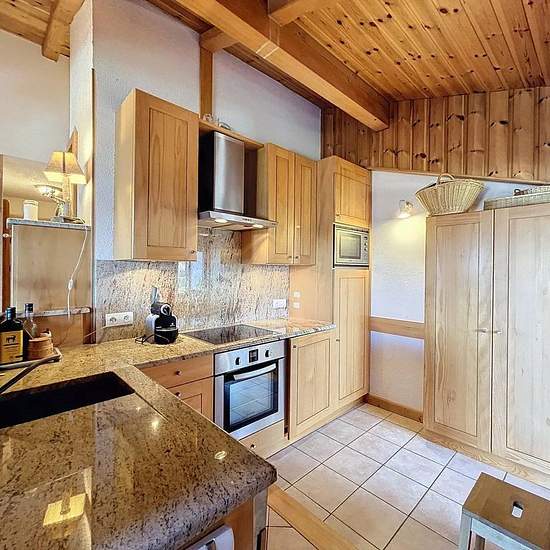 Situé à 1,2 Km du centre de Combloux, dans une résidence de standing, 3 pièces composé de : Une entrée avec placard, un séjour avec un clic-clac 2 personnes donnant sur un terrasse exposé Est, une cuisine ouverte équipé (four, micro ondes, plaques à induction, frigo freezer, lave vaisselle, lave linge, appareil à raclette et fondu, bouilloire, grille pain, Nespresso) avec un accès balcon (Nord), une salle de douche avec sèche serviette, une chambre avec un lit superposé et un lit tiroir, un wc, une chambre avec un lit de 160 et un lavabo. Ca...