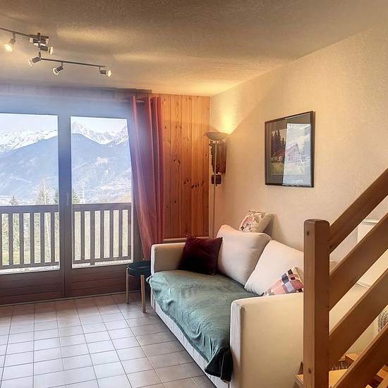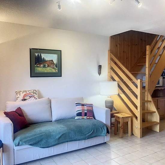Petit 3 pièces en duplex proche du centre village de Combloux et de la navette gratuite ski bus composé : d'une entrée avec placards, une salle de bain, un toilette indépendant, une pièce de vie avec cuisine toute équipée (Four, micro-ondes, lave-vaisselle, frigo, cafetière...) avec accès balcon face au Mont Blanc, à l'étage, une chambre avec 2 lits simples, une chambre avec lit double de 140, un espace coin nuit avec un lit enfant de 80/160, une salle d'eau avec lavabo et wc. Loué avec une place de parking en sous-sol et casier à skis. - A ...