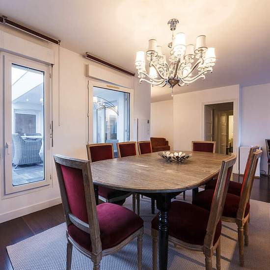 Large bright 5-room apartment for long-term rent in the suburbs of Paris - Courbevoie, located to the north-west of the city. Beautiful, well-furnished accommodation - a great option for families in a quiet area away from the bustle of the city. Surface - 170 square meters; 7th floor of a building with concierge, elevator, parking; a large outdoor terrace; view of La Defense; number of tenants - up to 6 persons. Minimum rental period - 2 months. Layout: a spacious and cozy saloon, an extra living room, three bedrooms, three bathrooms, thr...