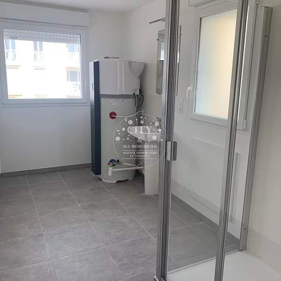 Entre plage et commerces, au 1er étage d'une résidence neuve, T3 traversant de 83m² avec grandes terrasses sur l'avant et sur l'arrière comprenant : Une entrée desservant : - une pièce à vivre avec espace cuisine (installation prévue prochainement) et accès à une terrasse de 26,56m² expo Sud-Ouest, - un cellier, Un dégagement desservant : - une salle-de-bains avec lavabo, une grande douche, - une première chambre de 10.83m² avec balcon de 13,43m² expo Nord-Est avec vue latérale sur la mer, - une seconde chambre de 9.13m², - un wc. Un cellier...