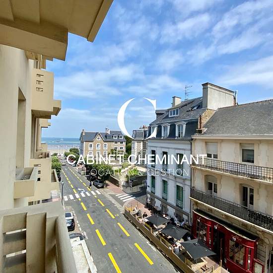 A DINARD, dans l'une des plus emblématique résidence du centre ville, au 2ème étage, cet appartement meublé T3 de 62m2, avec balcon et petite vue mer. Il se compose d'une entrée sur pièce de vie, avec coin cuisine équipée aménagée (hotte, plaques, four, frigidaire) d'une chambre avec lit double et dressing et d'une autre avec deux lits superposés. Un salle d'eau avec souche italienne et wc. Depuis le salon / séjour, vous avez accès au balcon avec vue mer. La résidence est équipée d'ascenseurs. Le plus , un droit au stationnement dans la cour...