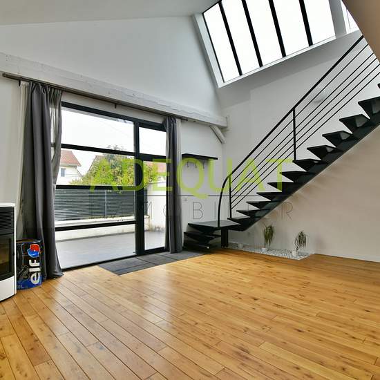 DOLOMIEU, à 10min de La Tour-du-Pin et de l'A43, appartement lumineux en duplex comprenant une grande pièce à vivre de 40m2 avec une cuisine US équipée, baies vitrées type atelier, 2 chambres à l'étage, 2 salle de bains et une buanderie. Terrasse de 25 m2 et 2 places de parking. Cauffage au sol, climatisation réversible, poêle à granules, double vitrage...Disponible en mars. Pour plus de renseignements CONTACTER Maya GALLIEN au 06x34x28x70x29.