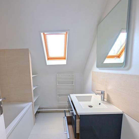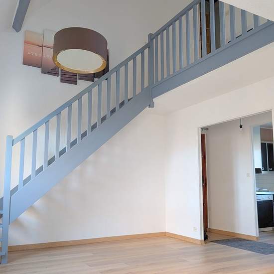 Nous vous proposons à Etrechy, proche Gare et Centre ville, dans un petit immeuble de 1981, un appartement duplex de 75 m2 en duplex. Se logement se compose d'une grande entrée avec placard, distribuant sur un sejour double avec balcon donnant sur jardin, une cuisine aménagée, une chambre, salle d'eau et wc. A l'étage un dressing, une grande chambre mansardée (possibilité de faire 2 chambres), et une salle de bains avec wc. Appartement rénové. Libre immédiatement.