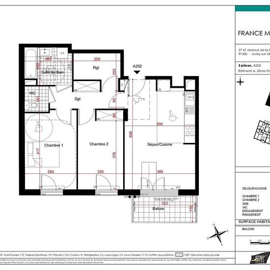 JUVISY-SUR-ORGE, au 55-61 Avenue de la Cour de France, proche des transports en commun, à 15 minutes à pieds de la Gare RER C et RER D. Appartement NON meublé. Au 2ème étage d'une belle résidence neuve Kaufman&Broad loue un beau T3 de 62m2, comprenant une entrée, un séjour, une cuisine ouverte à équiper, deux chambres, une salle de bains, des WC séparés et un balcon. 2 places de parking en sous-sol. Chauffage et eau inclus dans les charges.