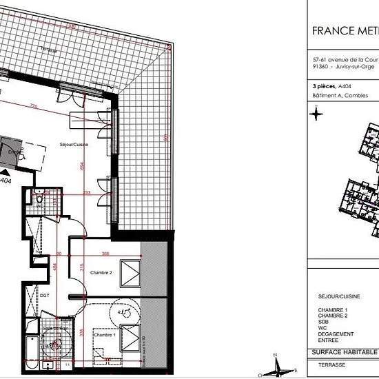 JUVISY-SUR-ORGE, Centre-ville, au 55-61 Avenue de la Cour de France, proche des transports en commun, à 15 minutes à pieds de la Gare RER C et RER D. Appartement NON meublé. Au 2ème étage d'une belle résidence neuve Kaufman&Broad loue un beau T3 de 75m2, comprenant une entrée, un séjour, une cuisine ouverte à équiper, deux chambres, une salle de bains, des WC séparés et une grande terrasse. 2 places de parking en sous-sol. Chauffage et eau inclus dans les charges.