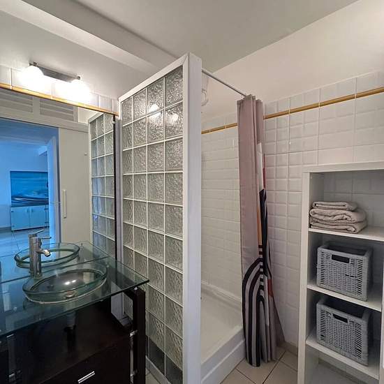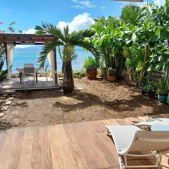 Bel Appartement T3 meublé les pieds dans l'eau, vue mer exceptionnelle, avec un accès a la plage, à Bas-du-Fort, secteur prisé, calme proche des commodités comprenant : 1 dégagement avec placard, 1 wc indépendant, 1 salle d'eau, 1 chambre climatisée avec placard, 1 espace bureau, 1 cuisine aménagée et équipée ouverte sur 1 salon salle à manger, 1 chambre climatisée avec placard avec accès sur l'extérieur, 1 salle d'eau, 1 terrasse, 1 carbet, 1 jardin de 32m2 non clôturé en bord de mer, Citerne d'eau de 650l. 1 place de parking dédiée. Montan...