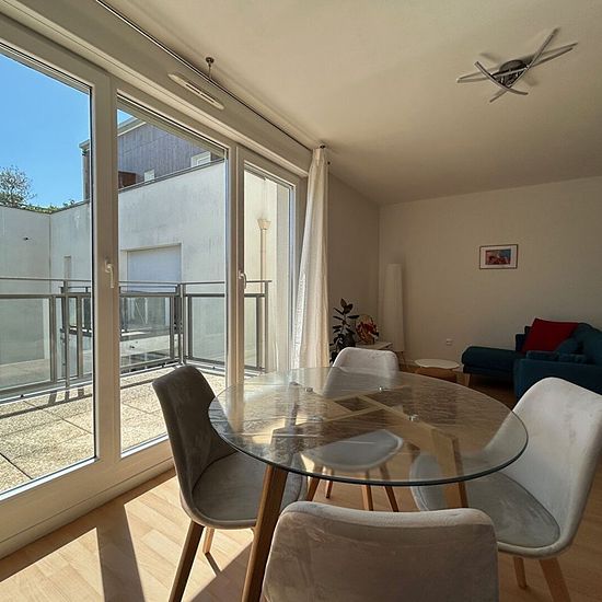 L'Agence Le Grand Chêne vous propose: Dans résidence construite en 2011, dans le centre ville des ULIS, avec vue dégagée au troisième étages sur quatre avec ascenseur, Un appartement de 3 pièces de 61 m² MEUBLE refait et équipé à neuf avec goût en 2025, l'appartement comprend une entrée, un séjour avec cuisine ouverte donnant sur une terrasse exposé plein sud de 5 m², dégagement, une salle de bains, 2 chambres, un water-closet. Deux places de parking en sous-sol Un garage vélo en commun. Libre à partir du 13 Avril 2026. Les charges comprenne...
