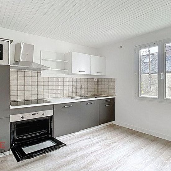 Référence G139- A louer Lesneven à 2 pas du centre ville, appartement de type 2 bis de 54 m² comprenant une pièce principale de 16 m², une chambre attenante à un bureau, une salle d'eau avec wc, une grande cuisine de 12 m² aménagée.