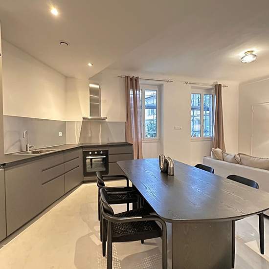 Carré d'Or. Rue de Rivoli. 3 pièces entièrement rénové, loué meublé. Au 2ème étage par escaliers d'un immeuble niçois. Exposé ouest sur cour au calme. Appartement lumineux et proche de toutes les commodités. Il est composé d'une spacieuse pièce de vie de plus de 33 m² avec une cuisine entièrement équipée (plaque induction, hotte aspirante, four, réfrigérateur et congélateur, lave vaisselle, lave linge), de deux belles chambres de 12,3m² et 13m² avec des penderies/rangements ainsi que d'une salle de douche avec toilette. Double vitrage et cli...