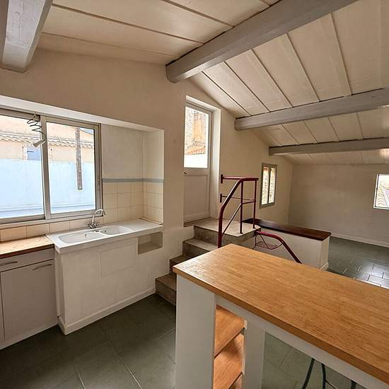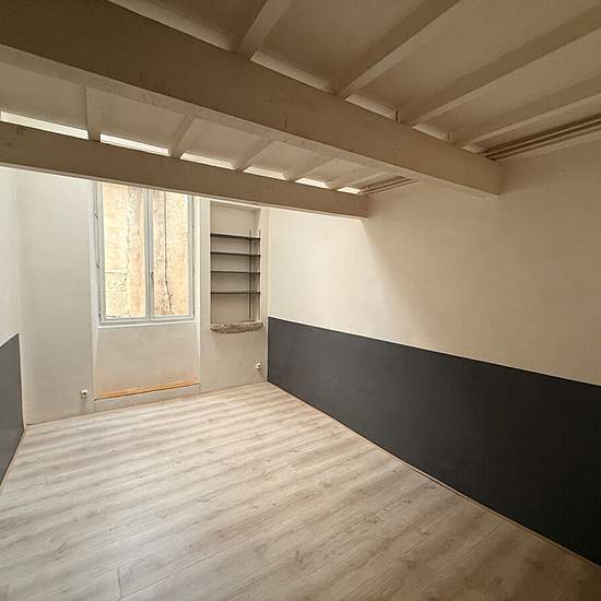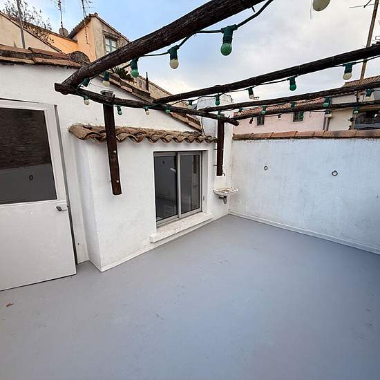 Près de la Maison Carrée et les halles, dans rue piétonne calme, appartement triplex atypique, au 2ème et dernier étage, accès par escalier étroit en colimaçon, belle terrasse sud-ouest, 2 chambres, une entrée/bureau, wc, dégagement, salle d'eau avec baignoire, petit salon, cuisine avec nombreux placards donnant sur la terrasse. Chauffage central au gaz. Calme et lumineux, ensoleillé. Remise au rdc pour cycles et matériel, pas de garage auto. Eau, électricité, gaz : compteurs individuels. Disponible à partir du 11 Février 2026.