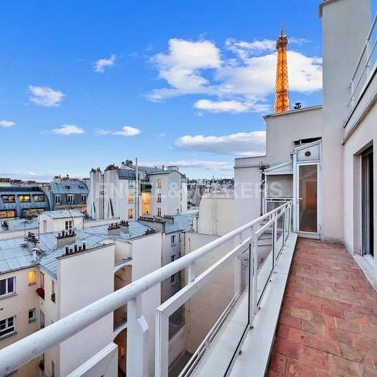 A deux pas du Champ de Mars et de la Tour Eiffel , à côté du Quai Branly nous vous proposons à la location pour une moyenne ou longue durée un trois pièces meublé de 68m², au 7e et dernier étage avec ascenseur d'une résidence de standing avec gardien et jardins. L’appartement avec vue sur les toits de Paris se compose d’une entrée , d'un salon avec salle à manger donnant sur la grande terrasse avec vue sur la Tour Eiffel , d'un bureau/deuxième chambre donnant sur une deuxième terrasse, d'une chambre principale avec dressing, d'une cuisine sé...