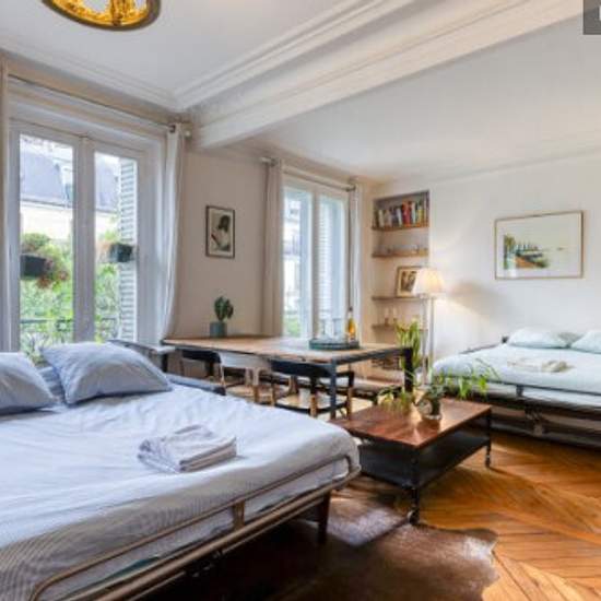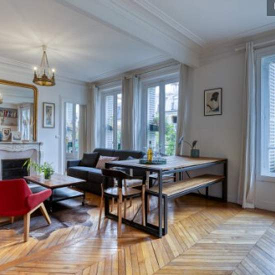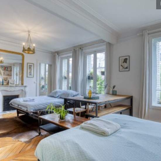 Superbe appartement cosy et plein de charme, situé dans l'une des rues les plus dynamiques de Montmartre, au pied de la Butte ! Quartier idéal et plein de vie (nombreux restaurants, commerces de bouche). A 100m du métro ! Décoré avec style et baigné de lumière et de verdure, l'appartement propose 7 couchages. Cuisine et salle de bain entièrement équipées. L'appartement est accessible par un très bel escalier parisien, refait à neuf, et n'est donc pas accessible aux personnes à mobilité réduite. La chambre comprend un lit double de 160cm de l...