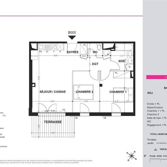 Résidence neuve située au coeur de Perpignan, proche du quartier Saint-Martin,des jardins de la Basse et ses rives aménagées. Venez découvrir cet appartement T3 situé au rez-de-chaussée. Il se compose d'une entrée, d'un séjour avec cuisine équipée (Evier Inox, meuble haut et bas, plaque 4 feux, hotte) s'ouvrant sur une terrasse de 8.00m², de deux chambres dont une avec placard, d'une salle de bain aménagée, d'un WC et d'un jardin de 51.92m². Il bénéficie de deux places de parking extérieur.