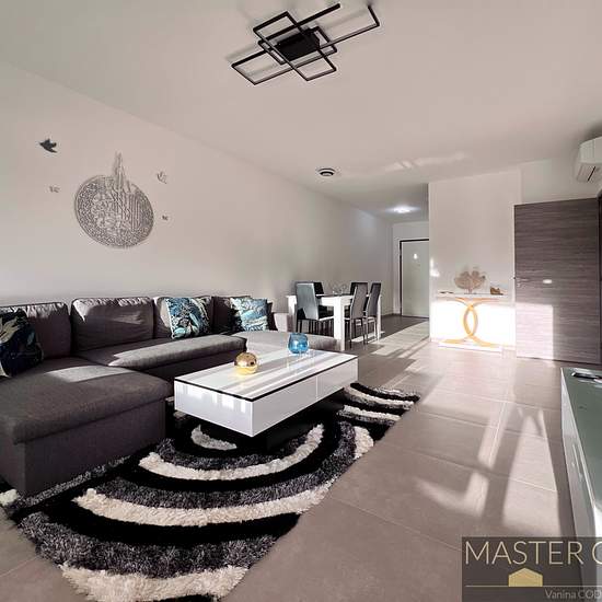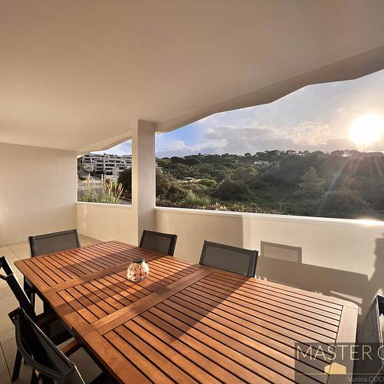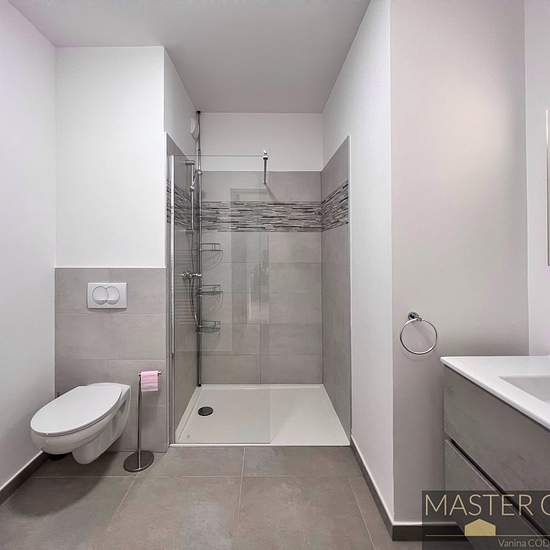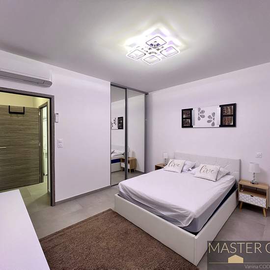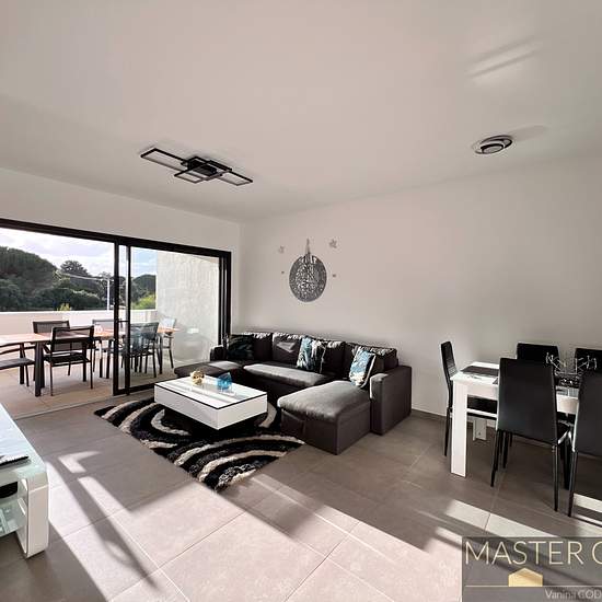 MASTER GROUP IMMOBILIER a le plaisir de vous proposer à location, un magnifique F3 de standing de 64 m2 entièrement meublé. Il se situe à PIETROSELLA dans une résidence récente face à la mer. Composition : 1 salon/séjour lumineux avec cuisine ouverte et équipée (meubles de rangements haut et bas - plaques électriques - four - hotte - réfrigérateur - machine à laver), donnant sur une grande terrasse privative de 20 m2. 2 belles chambres avec placards. 1 grande salle d'eau avec meuble vasque, sèche serviette et WC. Belles prestations - Stores ...