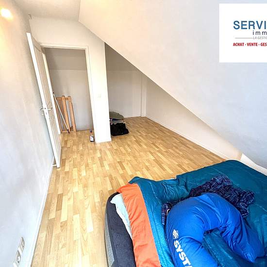 Votre Agence SERVIA immobilier QUEVEN vous propose à la location; Appartement T3 sur QUEVEN en duplex d'une surface habitable de 56 m² : Comprenant : Un séjour (placard penderie), une cuisine, ouverte et équipée (meuble de rangement haut et bas, évier, plan de travail aspirante, plaque de cuisson électrique, branchement pour machine à laver) une salle de bains (avec baignoire, lavabo et miroir), un w.c séparé. A l'étage : Un pallier desservant deux chambres. Les Atouts : Place parking privative La résidence comporte un local pour les vélos L...