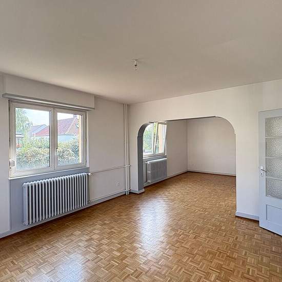 Appartement 3/4 pièces Reichstett 94.35m². Situé rue des Dahlias à Reichstett, Grand appartement 3/4 pièces de 94.35m² au rez-de-chaussée d'une maison bi-famille, Se compose d'une entrée avec placard, d'un grand séjour, d'une cuisine équipée, d'une salle de bain, de deux chambres, wc séparé, Une cave ainsi qu'un garage complètent le bien Chauffage collectif au fuel Disponible de suite